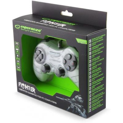 Геймпад Esperanza Fighter PC - функциональный геймпад с вибрацией для ПК. Отлично работает с продвинутыми играми. Эргономичная форма позволяет легко удерживать геймпад и не вызывает усталости во время игры. Вибрационные моторчики создают дополнительные эффекты, генерируемые играми. Особенности геймпада: - 2 аналоговых манипулятора