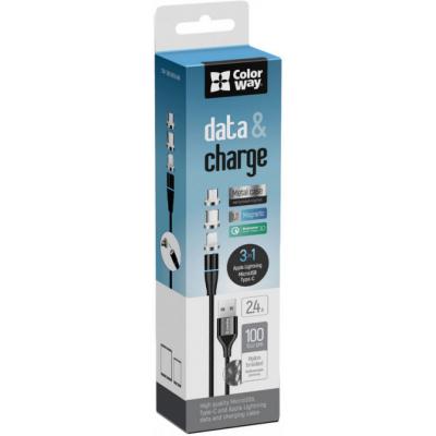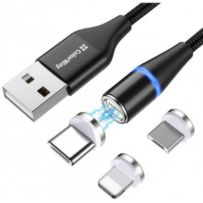 Дата кабель USB 2.0 AM to Lightning + Micro 5P + USB-C 1.0m Magnetic ColorWay (CW-CBUU038-BK) Тип - кабель, Тип коннектора 1 - USB 2.0, Тип коннектора 2 - micro USB, Lightning, USB Type-C, длина - 1 м, магнитные коннекторы, Цвет - черный