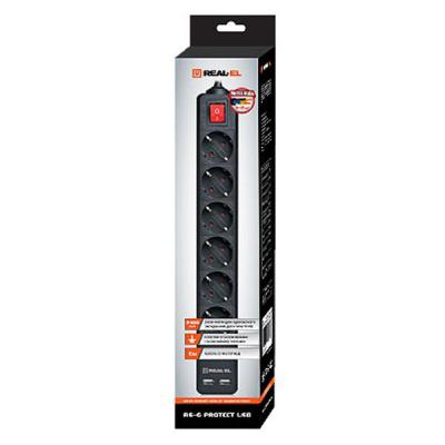 Сетевой фильтр питания REAL-EL REAL-EL RS-6 PROTECT USB, 5m, black (EL122300018) Количество розеток - 6, 2 x USB (type A), Длина кабеля - 5 м, контакт заземления, с общим выключателем, с USB, Суммарная мощность подключенной нагрузки - < 3680 Вт, RTL, Цвет - черный