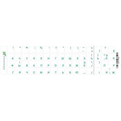 Наклейка на клавиатуру Grand-X 60 keys transparent protection Cyrillic green (GXTPGW) - украинский, русский, Прозрачность основы - прозрачная, Цвет основы - прозрачный, Цвет кириллицы - зеленый, Цвет латыни - зеленый