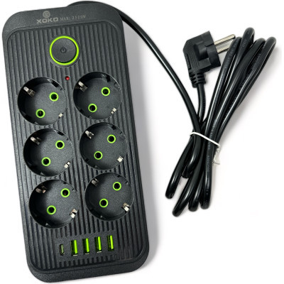 Сетевой фильтр питания XoKo XK-SP-6-4-2-BK Количество розеток - 6, 2 x USB (type C), 4 x USB (type A), Длина кабеля - 2 м, контакт заземления, с общим выключателем, с USB, быстрая зарядка USB, Суммарная мощность подключенной нагрузки - <= 3000 Вт, RTL, Цвет - черный