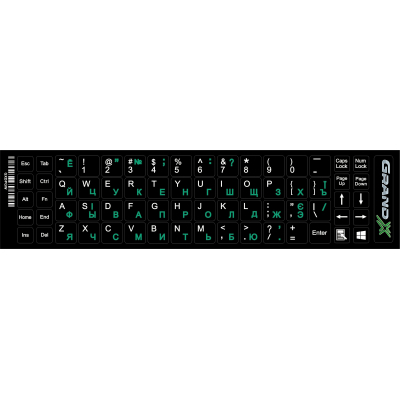 Наклейка на клавиатуру Grand-X 68 keys UA green, Latin white (GXDGUA) - английский, украинский, Прозрачность основы - непрозрачная, Цвет основы - черный, Цвет кириллицы - зеленый, Цвет латыни - белый